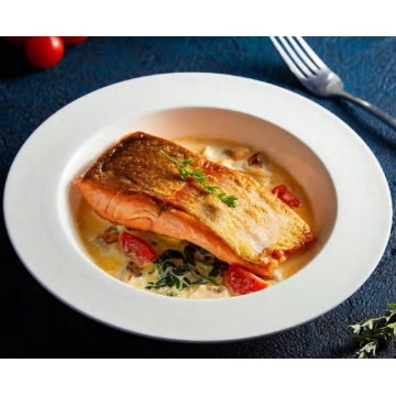 サーモン中腹部位を厳選、刺身用高級品種。肉質は芳醇な脂のりと滑らかな食感を兼ね備え、口いっぱいに広がる豊かな旨味と優雅な余韻をお楽しみください。