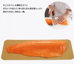 サーモン中腹部位を厳選、刺身用高級品種。肉質は芳醇な脂のりと滑らかな食感を兼ね備え、口いっぱいに広がる豊かな旨味と優雅な余韻をお楽しみください。